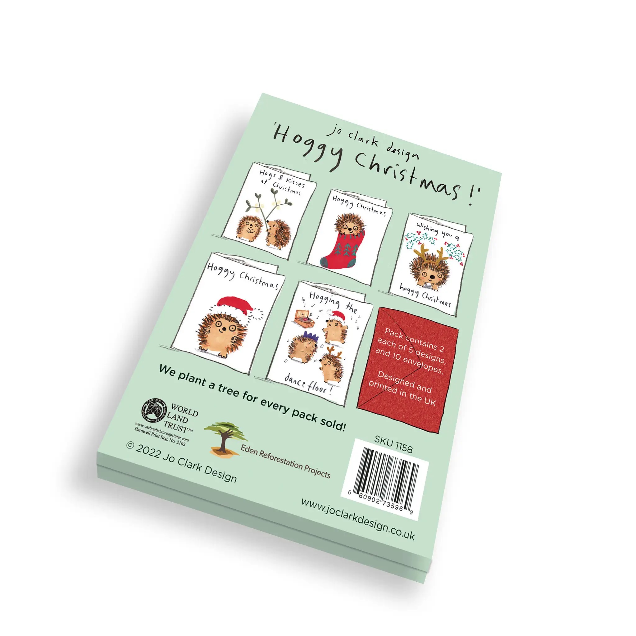 Denne multipakke indeholder to hver af 5 design  af pindsvin der fejre den festlige juletid. Pakken åbnes som en bog og afslører kortene. Pakken indeholder også 10 røde kuverter.